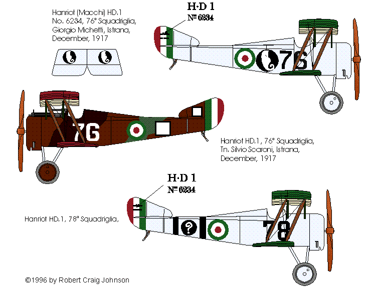 The Italians chose the airplane as the successor to the Nieuport 17, their then standard fighter. While some aircraft were imported from the parent firm, Nieuport-Macchi obtained a manufacturing license and became, in fact, the major builder of the type. During the massive Italian offensive of October 1918, 130 out of then 211 fighter squadrons available were mounted on Hanriot’s. Most of the Italian aces flew the Hanriot HD at one time or another, most notably Silvio Scaroni (26 victories). It saw service primarily on the Alpine and Venetian fronts, where it was frequently mistaken for a Sopwith in Austrian reports. But it also operated over Albania and Macedonia.